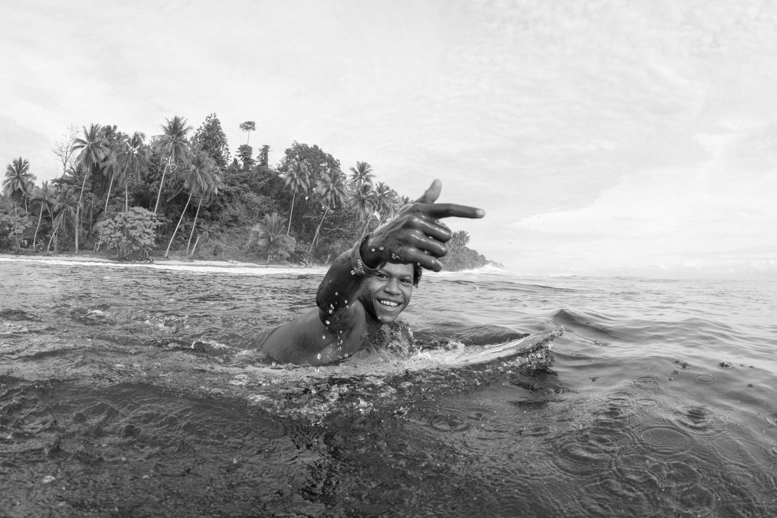 パプアニューギニアで自分で削った板でサーフィンする若者、ヤー声が聞こえてきそうだ!